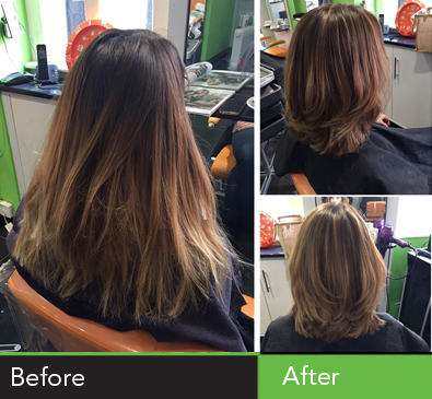 Before the visit, hair was coloured in a graduated ombré that had seen better days. After, hair was coloured and restyled to look vibrant with a soft balayage.